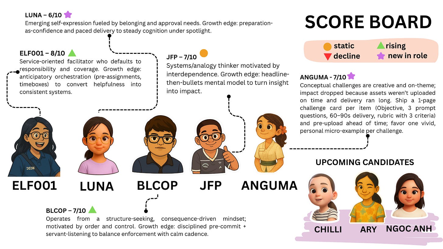 Key Highlight: Positioned as a rising service-oriented facilitator; emphasized creative thinking and openness to others’ ideas. Strong Facilitation, Inclusiveness, and Adaptability.