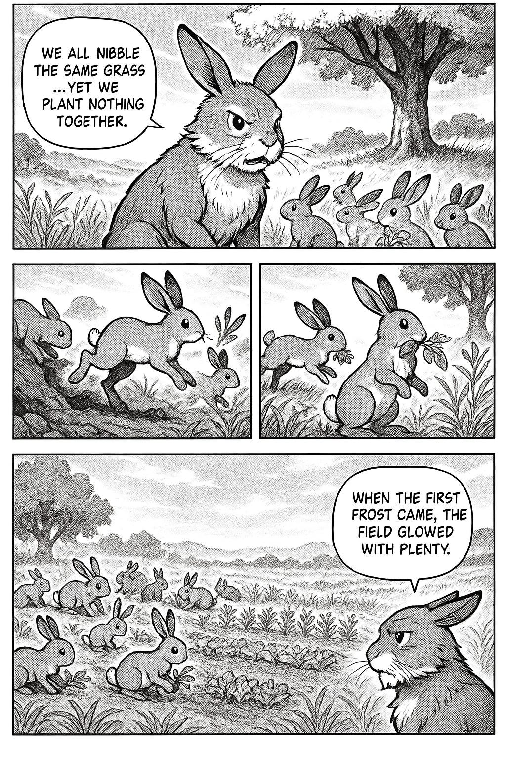 “We all nibble the same grass,” he began, “yet we plant nothing together. What if we grew more than we need—together?”At first, there was murmuring. Rabbits were creatures of habit. But slowly, ideas began to hop from mind to mind like sparks. Mossfoot the digger offered to carve out a shared pantry. Swiftpaw, the runner promised to fetch seeds from the far meadow. Willowtail, who knew herbs, suggested planting specialized crops for winter colds.They worked for many days, side by side. The ground softened under their combined digging. Burrows connected into a web. Clover spread like a green quilt. Even the smallest kits carried sprigs of thyme in their mouths to line the food store.When the first frost came, the field glowed with plenty. They had not only enough to eat but enough to share with the passing hares and sparrows. Chief Thistle watched from the hill and thought, This is the strength of paws working in the same soil.From then on, no rabbit in the field spoke of “my burrow” or “my clover.” They said, with bright eyes, “our home.”